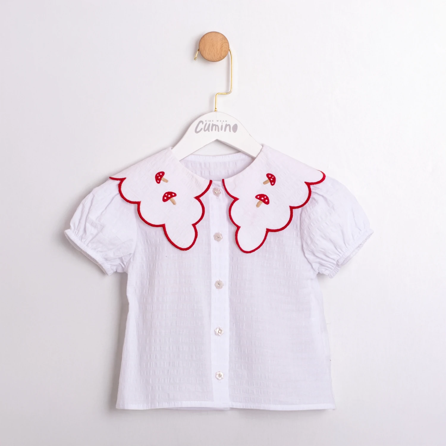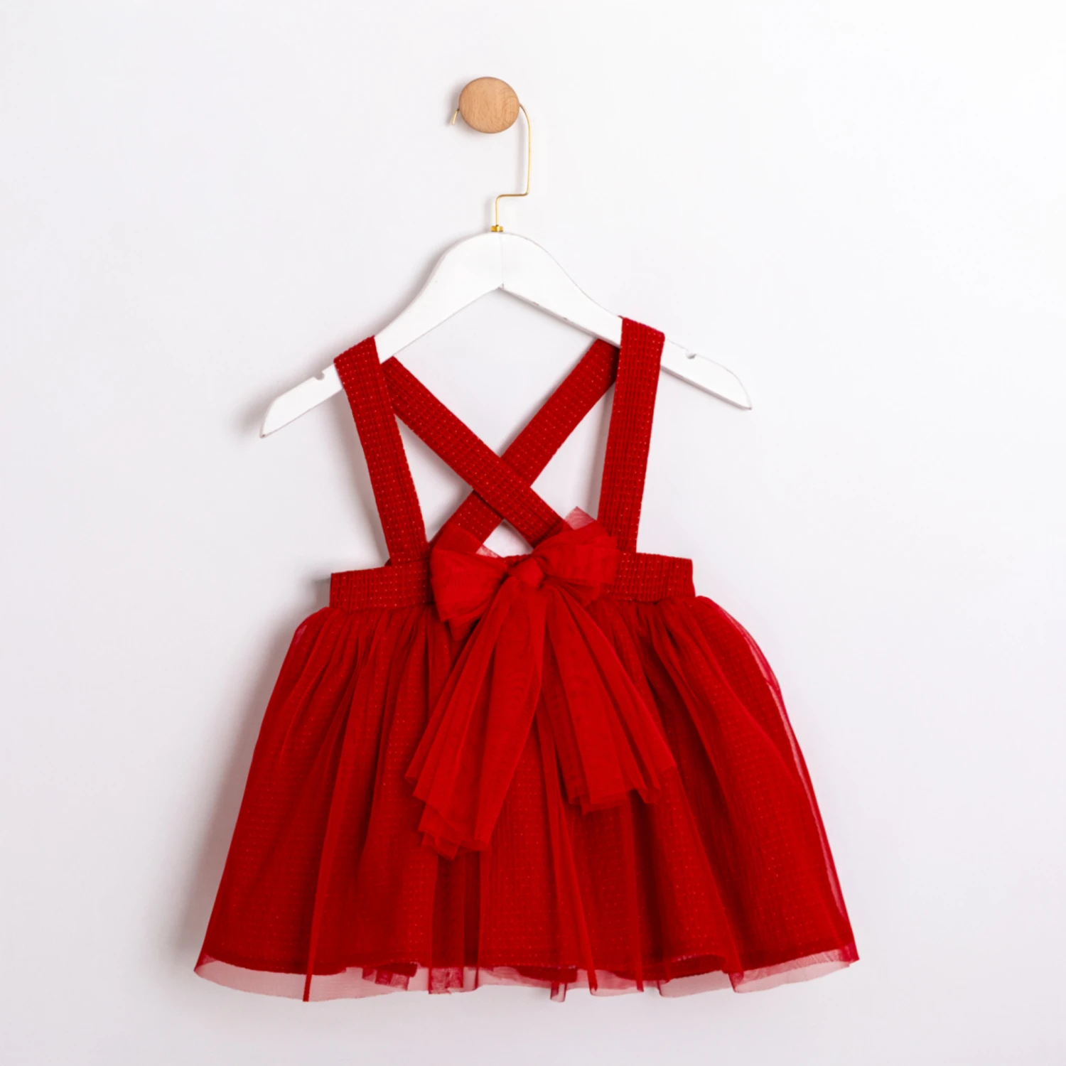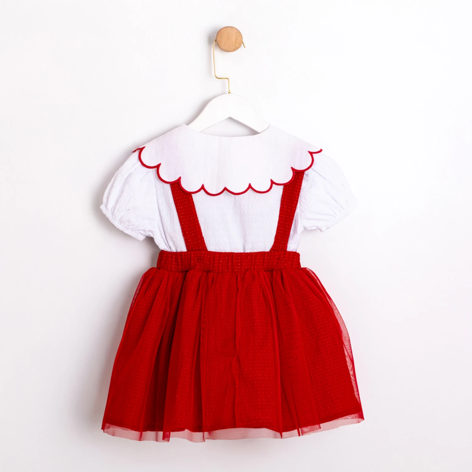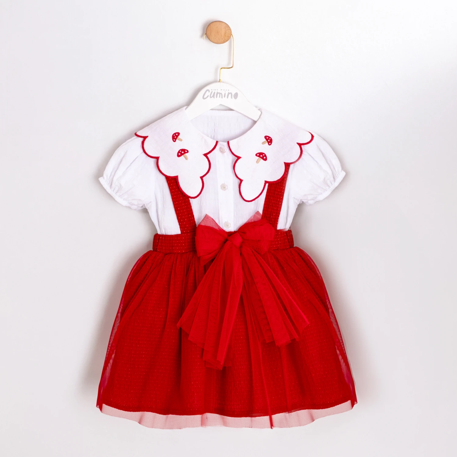 Whimsical red pinafore-style dress paired with a scalloped white blouse, finished with delicate embroidery and a bow at the waist. Available in classic red with white accents!